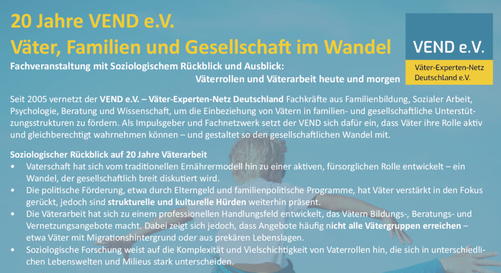 Seit 2005 vernetzt der VEND e.V. – Väter-Experten-Netz Deutschland Fachkräfte aus Familienbildung, Sozialer Arbeit, Psychologie, Beratung und Wissenschaft, um die Einbeziehung von Vätern in familien- und gesellschaftliche Unterstützungsstrukturen zu fördern. Als Impulsgeber und Fachnetzwerk setzt der VEND sich dafür ein, dass Väter ihre Rolle aktiv und gleichberechtigt wahrnehmen können – und gestaltet so den gesellschaftlichen Wandel mit.